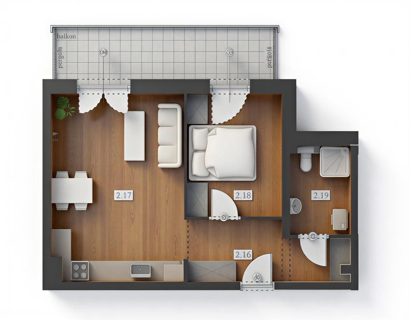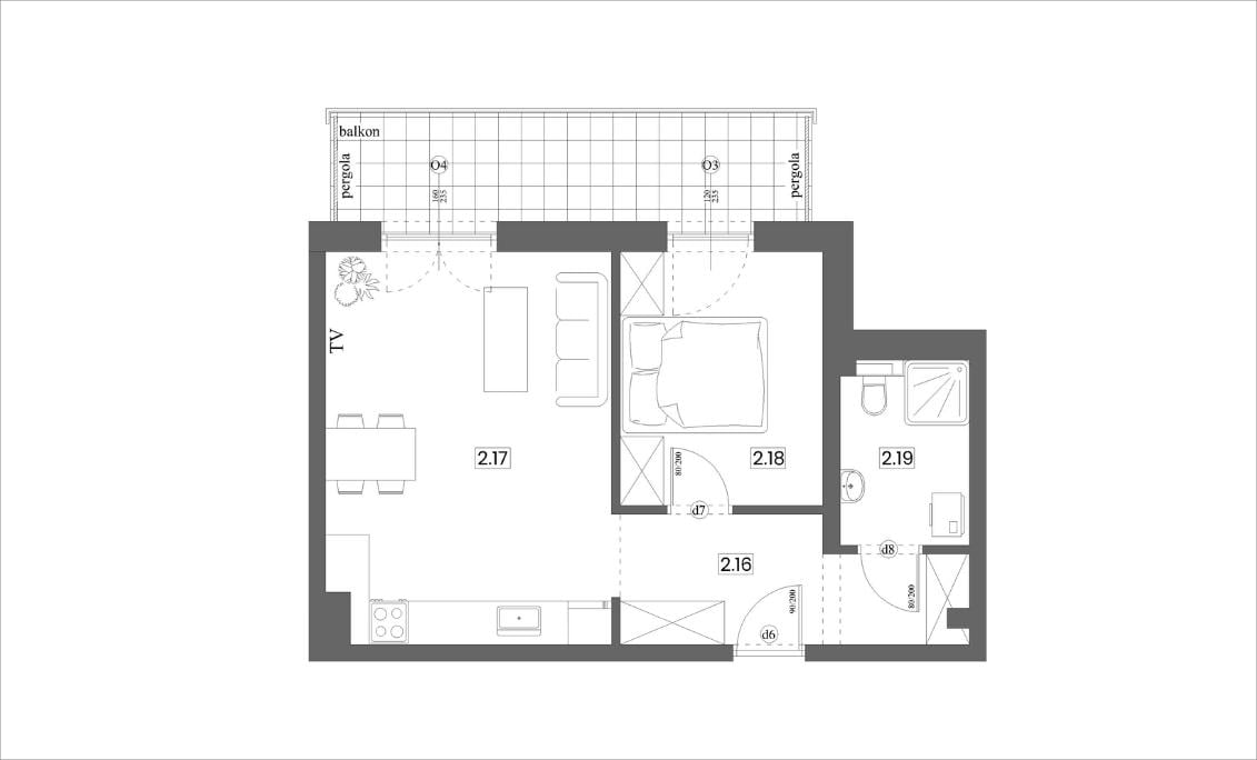To 2‑pokojowe mieszkanie o łącznej powierzchni 43,22 m², zaprojektowane z myślą o codziennym komforcie i praktycznym wykorzystaniu przestrzeni. Jasna i ustawna strefa dzienna z aneksem kuchennym (21,34 m²) stanowi centralne miejsce, które z łatwością możesz zaaranżować zarówno na strefę odpoczynku, jak i część do pracy czy przyjmowania gości — to przestrzeń, która naturalnie łączy funkcje życia codziennego.