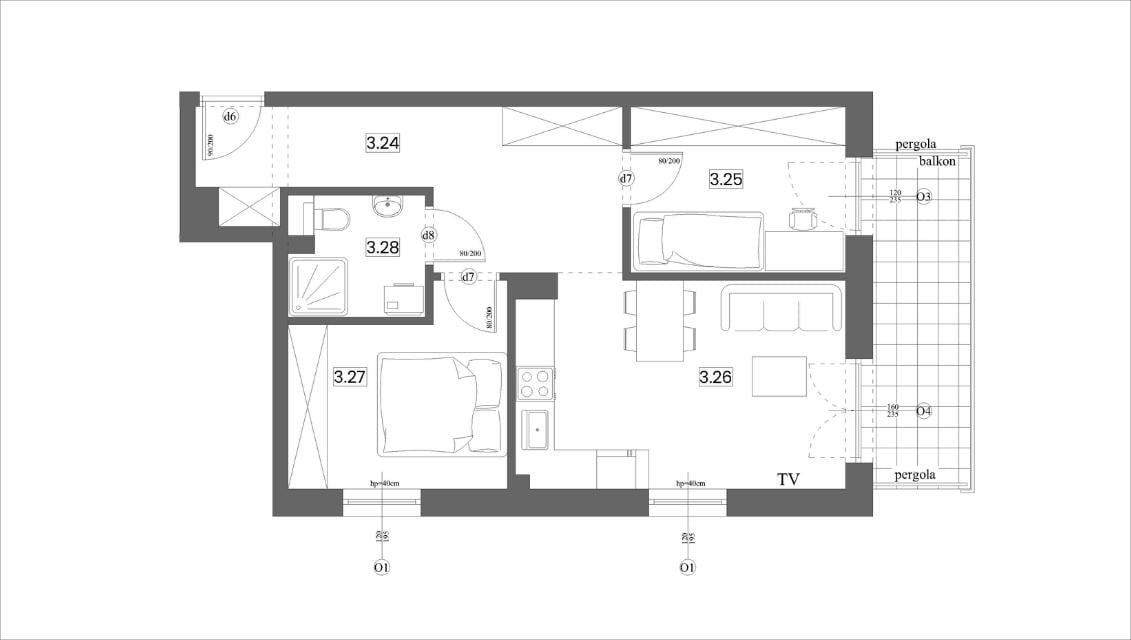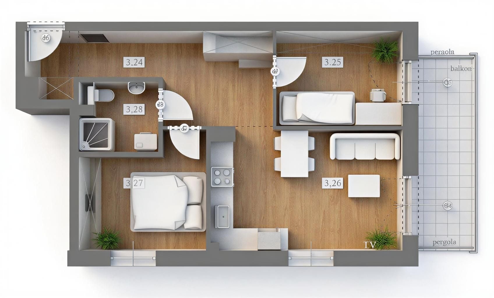 To 3‑pokojowe mieszkanie o łącznej powierzchni 47,89 m² (sumaryczny metraż poszczególnych pomieszczeń), zaprojektowane z myślą o komfortowym i praktycznym życiu na co dzień. Ustawna strefa dzienna z aneksem kuchennym (16,17 m²) stanowi centralne miejsce, w kt órym możesz wygodnie gotować, odpoczywać po pracy i spędzać czas z rodziną lub znajomymi — to serce mieszkania, które łatwo dopasujesz do własnej aranżacji.