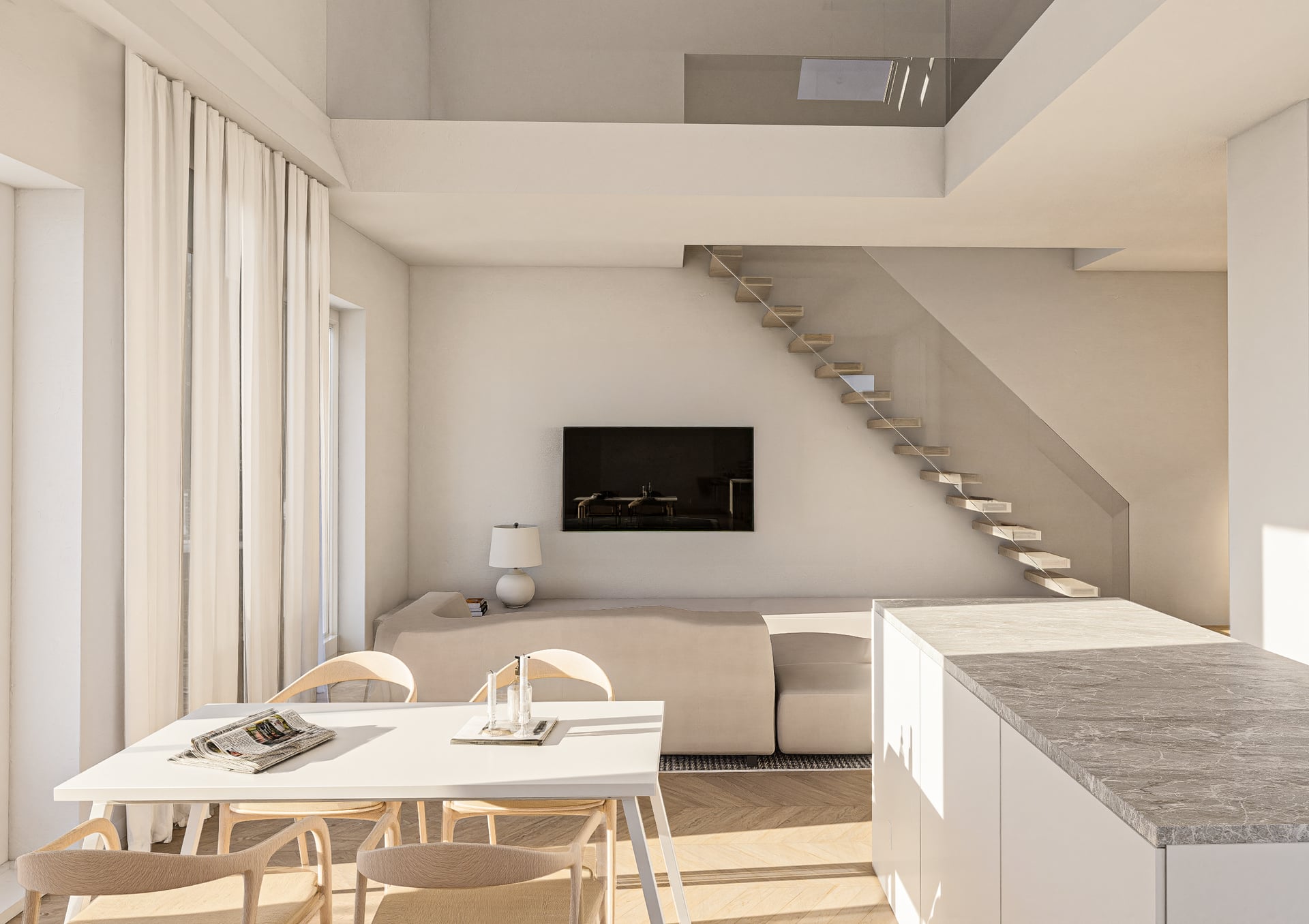 Wnętrze zostało zaprojektowane z myślą o codziennym komforcie. Przestronny pokój dzienny z aneksem kuchennym (32,97 m²) stanowi serce mieszkania – to jasna, ustawna przestrzeń, która z łatwością pomieści zarówno strefę wypoczynku, jadalnię, miejsce do pracy, jak i przestrzeń do relaksu.