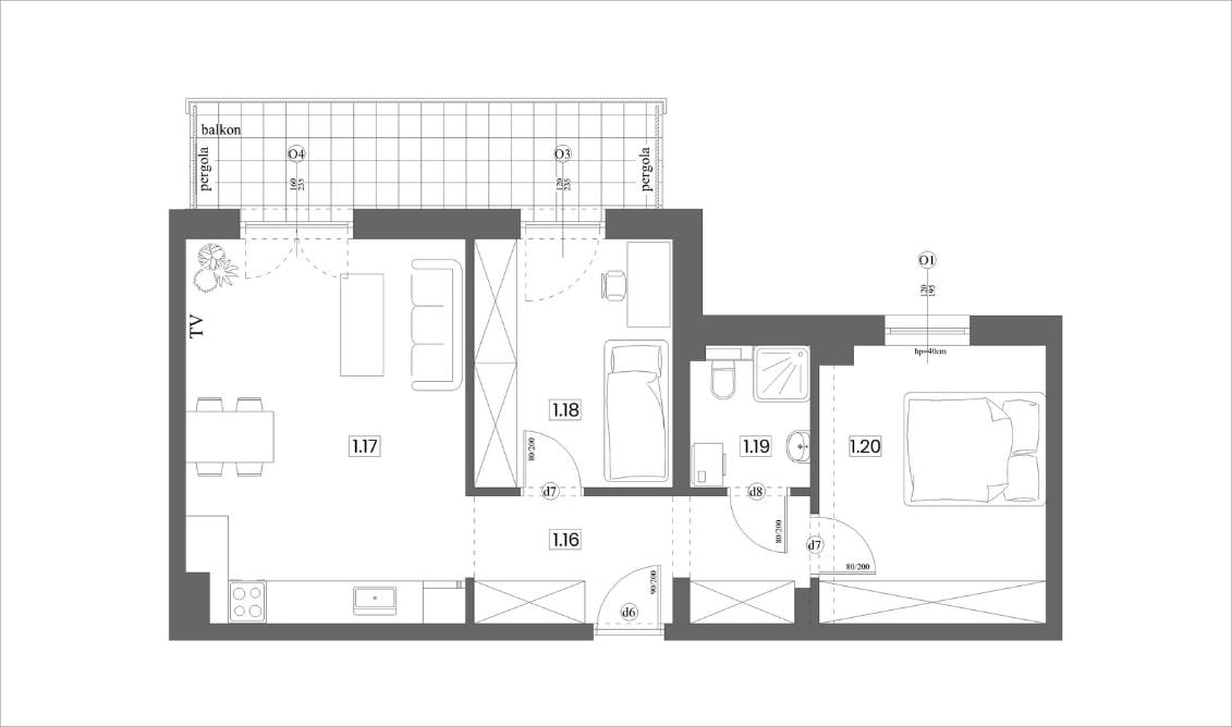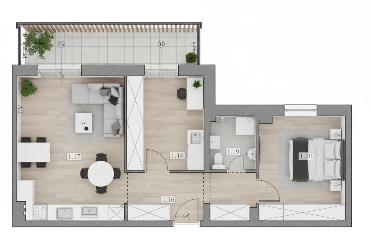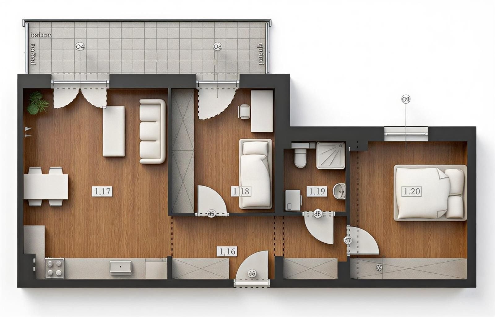 To przestronne, funkcjonalne mieszkanie 3‑pokojowe o łącznej powierzchni 55,24 m², zaprojektowane z myślą o codziennym komforcie i praktycznym wykorzystaniu każdego metra. Strefa dzienna z aneksem kuchennym (21,32 m²) jest sercem mieszkania – jasna i ustawna, z miejscem na wygodną sofę, stół do pracy czy rodzinne posiłki. Można w niej również wydzielić część sypialną, np. przy pomocy przesuwnej ścianki, co daje elastyczność w aranżacji przestrzeni.