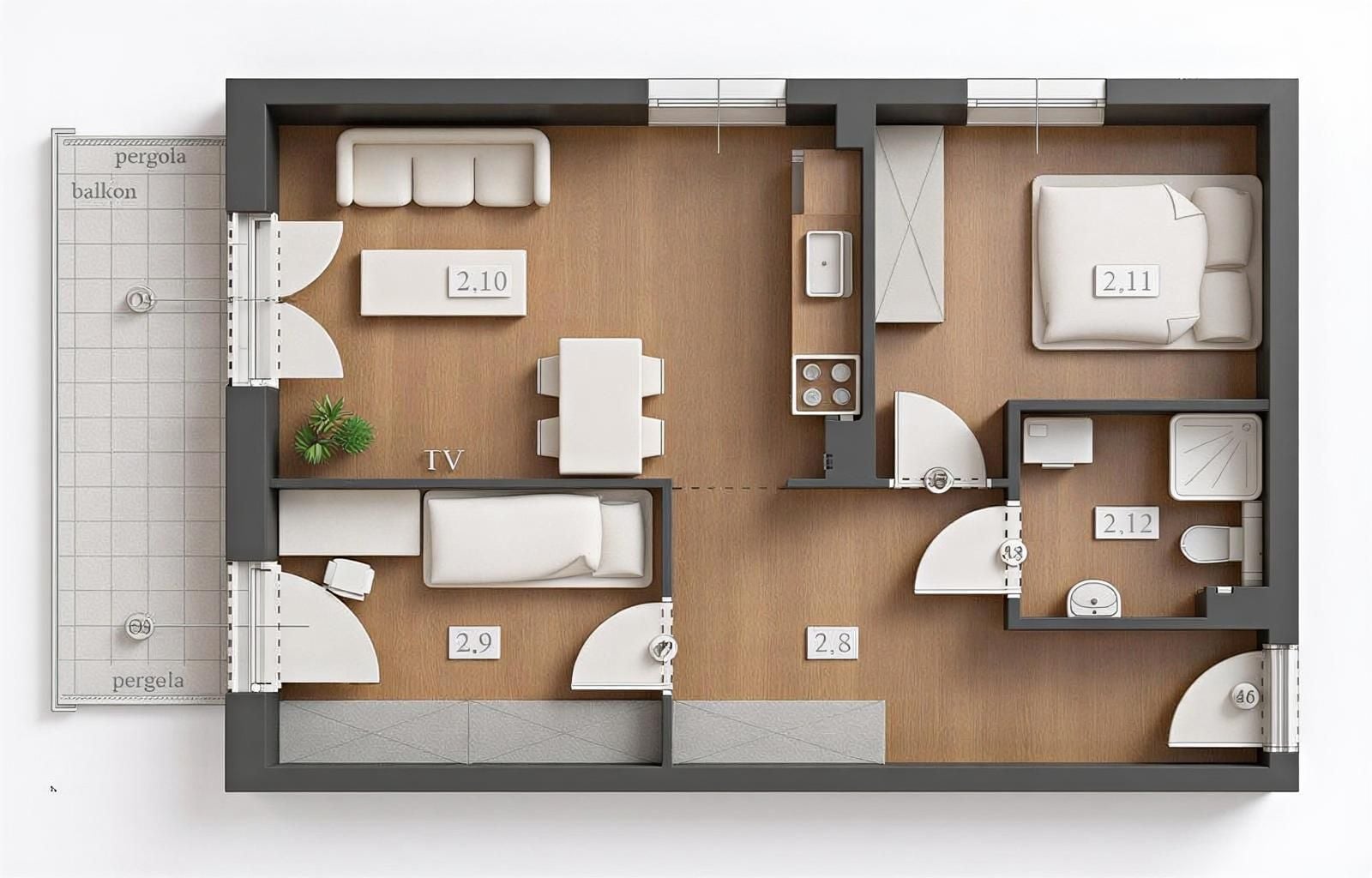 To 3‑pokojowe mieszkanie o powierzchni 47,87 m², zaprojektowane z myślą o codziennym komforcie i praktycznym wykorzystaniu przestrzeni. Jasna i ustawna strefa dzienna z aneksem kuchennym (16,19 m²) stanowi serce mieszkania – to idealne miejsce do wspólnego gotowania, relaksu, pracy czy spotkań z rodziną i znajomymi. Elastyczny układ pozwala łatwo wydzielić część sypialną w salonie, jeżeli tego potrzebujesz.